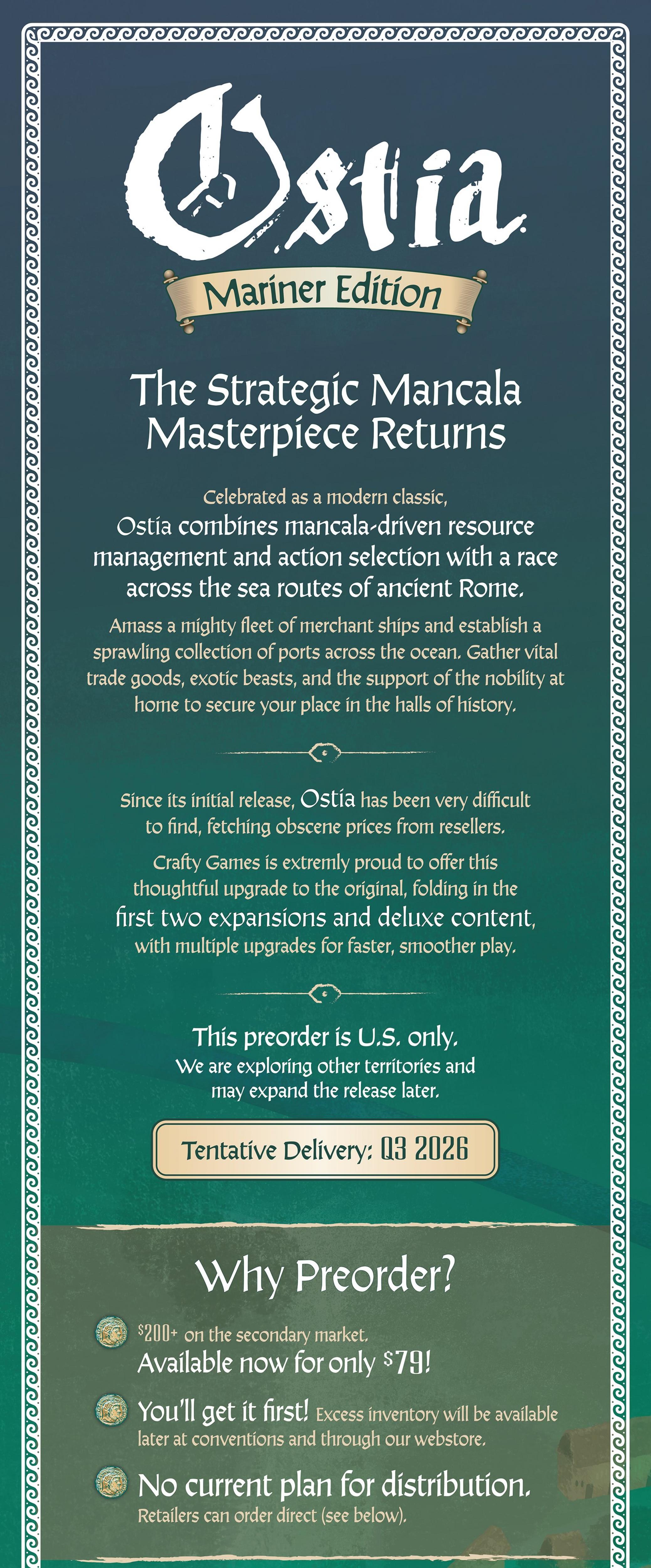 There are currently no plans to offer the Ostia Mariner Edition into distribution. This may change, but for now the best way to get the game in the United States is this preorder. We are happy to offer this preorder direct to retailers at wholesale prices. Interested retailers should email our sales representatives at sales@crafty-games.com.