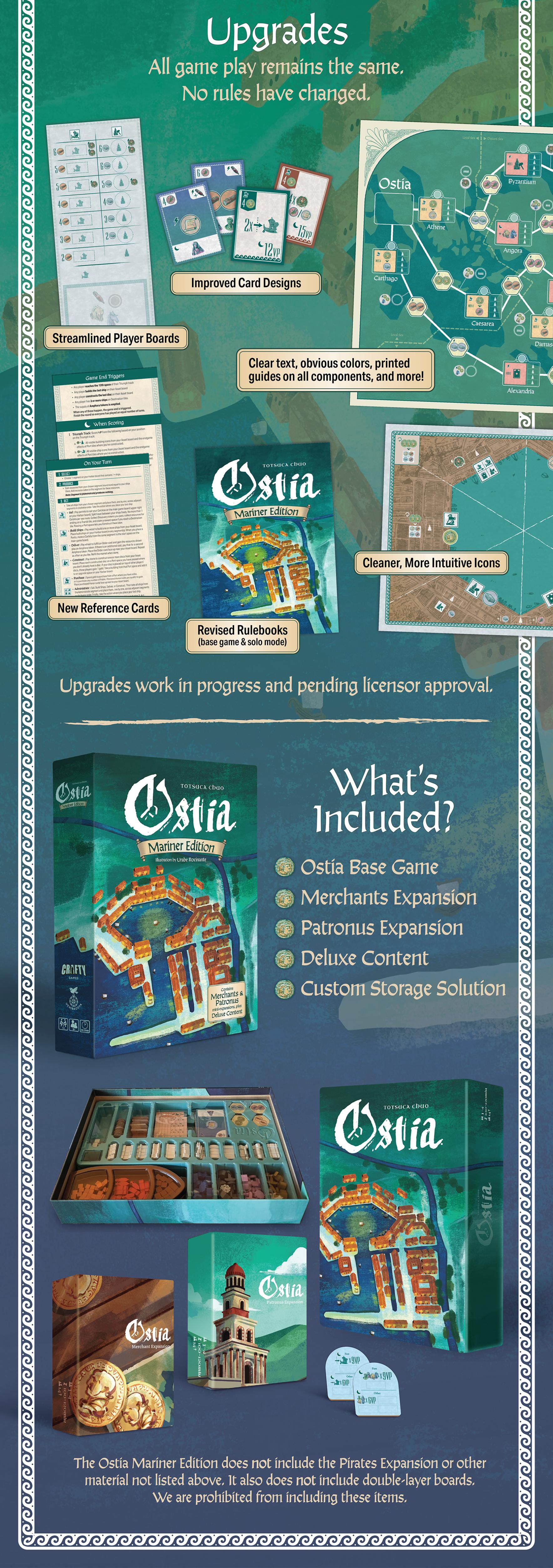 However, because we have changed some icons and language to improve the overall experience, it may be challenging for some players who find it difficult to connect different visuals or terms that mean the same thing. In those cases, we recommend against buying the Ostia Mariner Edition if you also want the Pirates expansion.
